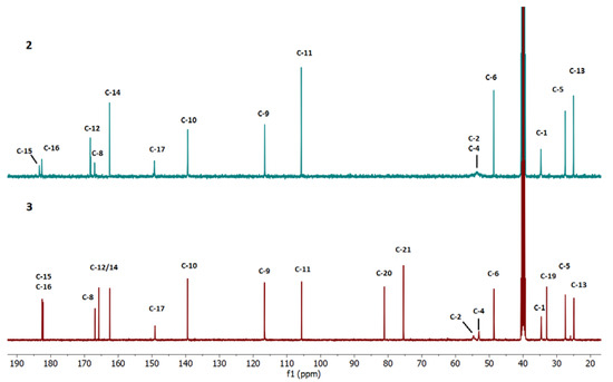 13C-NMR—comparison of the chemical shifts of compounds 2 and 3 in DMSO-d6.