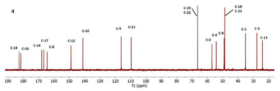 These superimposed signals pose challenges in assignment of chemical shifts in the 1H NMR analyses. The measured spectra of new compounds 2, 3, 4, and 5 are included in the Supplementary Section. Moreover, due to the hydrogen bonds of the amine groups, the 13C NMR spectra of compounds 2 and 3 exhibit faint and distorted signals of very low intensity (Figure 16, between 50–60 ppm). These signals correspond to the chemical shifts of the C-2 and C-4 carbon atoms in ring C of the cytisine molecule and may be influenced by proton interactions with N-18 nitrogen atom. In contrast, the 1H-NMR and 13C-NMR spectra of bisquaramide-cytisinium (5, Figure 18) reveal a perfectly symmetric molecule.