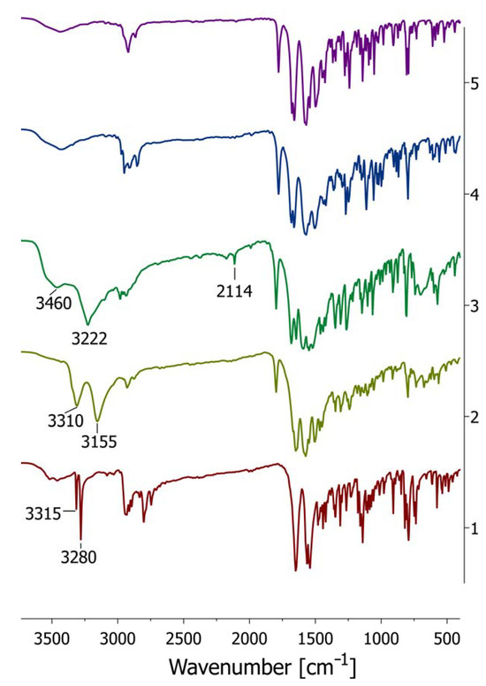 The overlapped FT–IR spectra of cytisine 1 and crystal of cytisine squaramides 2, 3, 4, and 5 in KBr tablets in the range 3750–400 cm−1.