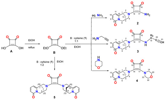 The reaction of (−)-cytisine with diethyl-squarate in abs. ethanol at a 2:1 molar ratio proceeded overnight at room temperature, resulting in the formation of bis-cytisine squaramide (5, Scheme 2).