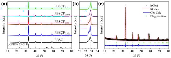 (a) XRD patterns of the cathode material PBSCFx; (b) localized magnification; (c) Rietveld refinement pattern of the PBSCF0.05 sample.