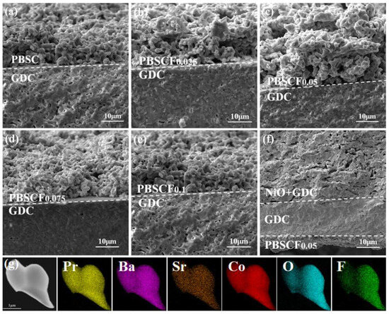 Figure 2 shows the cross-section SEM of the PBSCFx series cathode materials uniformly brushed on both sides of the GDC electrolyte by screen printing technology to prepare PBSCFx|GDC|PBSCFx symmetrical cell. Figure 2a–e specifically display the connection interface between PBSCFx and GDC. Figure 2f shows the cross-section of NiO + GDC|GDC|PBSCF0.05 of a single cell. The cathode material of PBSCFx demonstrated good compatibility with the electrolyte and anode of GDC, as well as good contact without delamination. The good compactness of the GDC electrolyte was observed in the electrolyte region. Figure 2g shows the EDS element distribution diagram of the PBSCF0.05 cathode material. All elements (Pr, Ba, Sr, Co, O, and F) in PBSCF0.05 were uniformly distributed without obvious elemental segregation, and the results were consistent with the chemical formula shown in Table 2. F element was successfully doped into the lattice of PBSC perovskite oxide, which was consistent with the conclusion obtained by XRD.