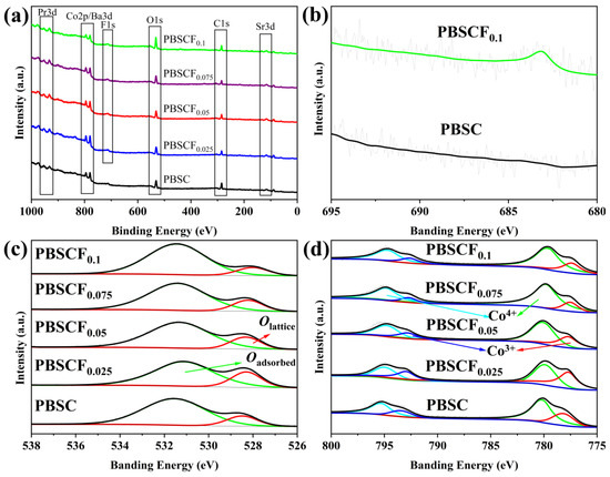 To explore whether F was successfully doped into the lattice of PBSCFx cathode materials, we performed XPS analysis on all samples. Figure 3a shows the XPS full-spectrum analysis of the PBSCFx series cathode materials. We observed binding energy peaks of corresponding orbitals from elements Pr, Ba, Sr, Co, F, and O. The position and proportion of binding energy of each element are shown in Table 3. The XPS peaking diagram of F1s in Figure 3b reveals a peak of the cathode material PBSCFx at a binding energy of 684 eV when the doping amounts were x = 0 and 0.1, showing that the valence state of F was −1 [21]. This peak was not detected in the PBSC sample. Analysis of the data in Table 3 revealed a minor discrepancy between the atomic content ratio of O and F compared with the theoretical value, suggesting that F could be successfully introduced into the cathode material via the sol–gel method. Furthermore, as the F content increased, the proportion of O gradually decreased, indicating that F successfully substituted a portion of oxygen. As shown in Figure 3c, peak division operation was carried out for O1s of PBSCFx material, and the results showed that O1s revealed two peaks: one at a low binding energy corresponding to Olattice and another at a high binding energy corresponding to Oadsorbed [22]. The increase in oxygen binding energy indicated a reduction in the Coulombic interaction between the B-site metal ion and O2− ion, thereby improving the reactivity of lattice oxygen and reducing the activation energy required for the migration of the O2− ion [20]. Table 4 shows that an appropriate amount of F doped into the O site could enhance the adsorption of oxygen. Figure 3d shows the XPS data of Co2p for PBSCFx and the sub-peak fitting results. The XPS signal of Co2p showed two peaks of high binding energy and low binding energy, corresponding to Co2p1/2 and Co2p3/2, respectively. The Co2p1/2 peaks were classified as Co3+ and Co4+ according to the binding energies of 792.9 ± 0.5 and 794.8 ± 0.5 eV, respectively. The Co2p3/2 peaks were classified as Co3+ and Co4+ according to the binding energies of 777.5 ± 0.5 and 779.6 ± 0.5 eV, respectively [23]. The specific location of binding energy and content are listed in Table 5. An appropriate increase in the F content results in an increase in Co3+ levels and a decrease in the Co4+ content. The increase in Co3+ can improve the electrochemical properties of materials.