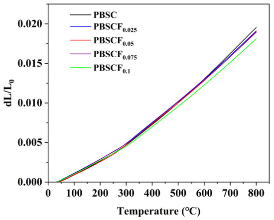 Figure 4 shows the thermal expansion curves of the PBSCFx series cathode materials measured in argon atmosphere at 30–800 °C. These curves gradually deviated with the increase in temperature, which may be caused by the accelerated release of lattice oxygen [24]. The average TEC of the PBSCFx series cathode materials was calculated according to the thermal expansion curve, and the data are listed in Table 6. As shown in Table 6, with the increase in F doping, the average TEC gradually decreased, and the doping of F reduced TEC from 25.3699 × 10−6 K−1 of PBSC to 23.5295 × 10−6 K−1 of PBSCF0.1, which was 7.25% lower than the TEC of the sample without F doping. For Co-based perovskite oxides, their chemical expansion is mainly due to the predominance of Co in a low spin state at low temperatures, and Con+ reduction results from the transition of Co to a high spin state or the release of lattice oxygen as temperature rises [25,26]. Nonetheless, appropriate F doping can effectively inhibit the reduction of Con+, reducing the formation of oxygen vacancies and effectively decreasing the TEC of PBSCFx. Thus, the thermal stability of the material improved.