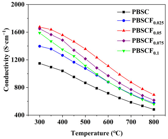 When the doping amount of F in PBSCFx series samples was 0.05, the conductivity was the highest, indicating that the appropriate amount of doping increased the electron hole concentration. By contrast, when the doping amount was greater than 0.05, the conductivity decreased probably because part of oxygen was released from the lattice after F replaced O; this phenomenon produced a large number of oxygen vacancies, inhibiting electron transfer and increasing conductivity.