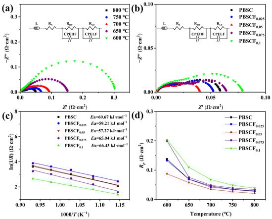 (a) Nyquist curve of PBSCF0.05|GDC|PBSCF0.05 in the range of 600–800 °C; (b) Nyquist curve of PBSCFx|CGO| PBSCFx at 800 °C; (c) Rp Arrhenius diagram of PBSCFx in the range of 600–800 °C; (d) the ASR curve of PBSCFx series cathode materials as a function of temperature.