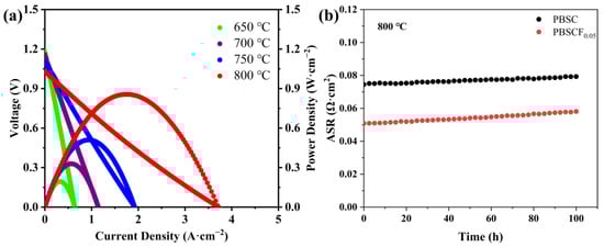 (a) I–V–P curve of the single-cell PBSCF0.05|GDC|NiO + GDC; (b) long-time ASR stability of the symmetrical cells PBSC|LSGM|PBSC and PBSCF0.05|LSGM|PBSCF0.05 at 800 °C.