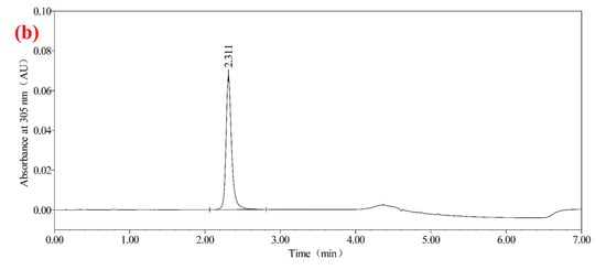 Ultra-high-performance liquid chromatography (UHPLC) analyses were conducted using a Waters Acquity Premier UHPLC system (Waters Corporation, Milford, MA, USA), equipped with a UV-visible detector for detection at 305 nm. Chromatographic separation was carried out using an ACQUITY UPLC CSH Fluoro Phenyl column (2.1 mm × 50 mm, 1.7 µm, Waters Corporation, USA). The balance used for precise weighing was a Mettler Toledo XPR205 electronic analytical balance (Mettler Toledo, Zurich, Switzerland, accuracy of 0.0001 g). For sample preparation, an ultrasonic cleaning machine (Emerson, San Francisco, CA, USA), operating at 350 W and 35 kHz, was employed. The separation was performed using a 40% methanol aqueous solution as the dilution solvent and gradient mobile phase composition. Data acquisition and processing were performed with Empower 3 Software (Waters Corporation, USA).