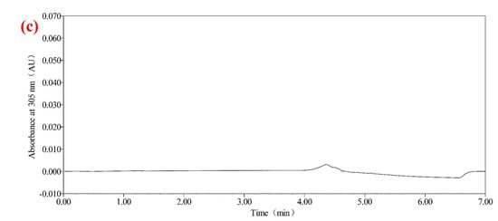 Chromatograms of urolithin A test solution, urolithin A standard working solution (1 μg/mL), and diluent: (a) chromatogram of the test solution of urolithin A; (b) chromatogram of urolithin A standard working solution; (c) diluted liquid chromatogram.