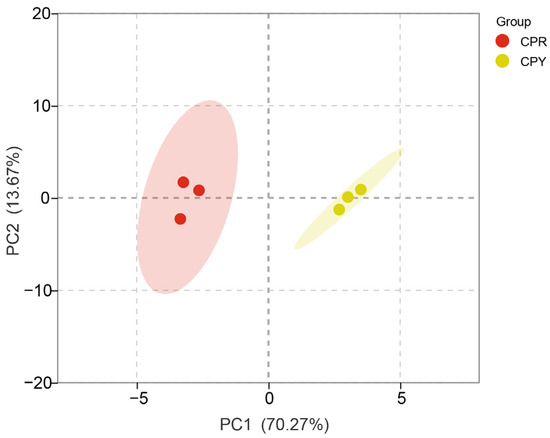 Principal component analysis (PCA) is an unsupervised discriminant method that can evaluate the clustering relationship of red-peel (CPR) and yellow-peel (CPY) hawthorn samples. PCA analysis was performed on the anthocyanin metabolites of CPR and CPY (Figure 1). The samples in the same group were clustered together, and there were great differences between CPR and CPY, indicating that the samples within the group had good repeatability, the data of the samples were reliable, and the subsequent differential metabolite analysis could be performed. The scores of PC1 and PC2 were 70.27% and 13.67%, respectively. This result showed that the representative features of most metabolites were well aggregated.