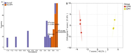 OPLS-DA analysis of CPR and CPY ((A) OPLS-DA verification plot of CPR and CPY; (B) OPLS-DA score plot of CPR and CPY, tthe shaded area represents the 95% confidence interval; ordinate and abscissa represent the scores of orthogonal and principal components in the OSC process, respectively).