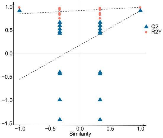 Orthogonal partial least squares discriminant analysis (OPLS-DA) was also used to show the difference between CPR and CPY and to further screen differential metabolites. The results showed that the parameters R2X and R2Y of the OPLS-DA model were 0.698 and 0.999, respectively (Figure 2A), which indicated that the interpretation rate of the model was good. Q2 was 0.925, indicating that the prediction ability of the model was high. In the OPLS-DA model score plot, the T score of the principal component in the OSC (orthogonal signal correction) process was 48.2%, showing that the difference between the two groups was obvious. The orthogonal T score was 21.6%, indicating that the difference within the group was small (Figure 2B). The permutation test results showed that as the replacement retention decreased, R2 and Q2 decreased, and the regression line showed an upward trend, which indicated that the model did not have overfitting and was effective and repeatable (Figure 3).