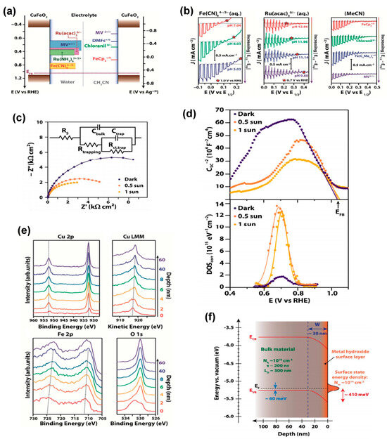 (a) Schematic representation of the potential regions probed by the different redox couples shown next to the band position of CuFeO2. (b) LSV curves of CuFeO2. (c) Typical Nyquist plots representing EIS data for a CuFeO2 electrode, along with the equivalent circuit used to fit them. (d) Mott−Schottky plots of CuFeO2 electrodes and the corresponding density of surface states (DOS) extracted from Ctrap. (e) XPS spectra as a function of depth of Cu 2p, Cu LMM, Fe 2p, and O 1s. (f) Proposed energy band diagram for an isolated CuFeO2 electrode in the dark. Reprinted with permission from ref. [67], Copyright (2017), Chemistry of Materials.