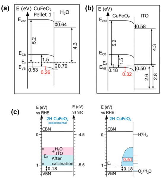 Energy band diagrams of CuFeO2−H2O (a) and the CuFeO2−ITO (b) interface, revealing the Fermi level tunability in 2H CuFeO2 hexagonal nanoplatelet−shaped powder materials. (c) Corresponding summary of the experimental Fermi level ranges after interface formation (ITO or water). Reprinted with permission from ref. [69], Copyright (2020), Advanced Functional Materials.