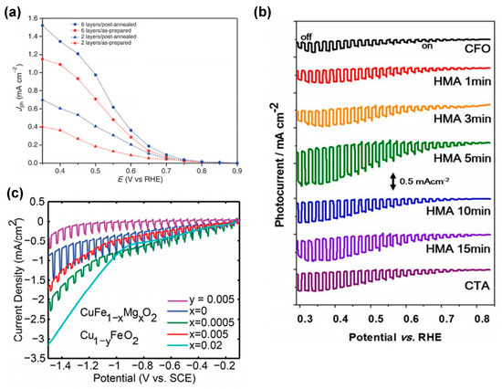(a) Photocurrent (total current minus dark current), Jph, as a function of applied potential for a six-layer CuFeO2 electrodes obtained in oxygen-saturated 1 M NaOH under one sun illumination before (red) and after (blue) post−annealing at 300 C in air. Reprinted with permission from ref. [71], Copyright (2015), ChemSusChem. (b) Current (J) -potential (V) curves of untreated CuFeO2, and post-treated CuFeO2 by CTA and HMA. Reprinted with permission from ref. [80], Copyright (2016), Chemistry of Materials. (c) Linear sweep voltammetry measurements of CuFe1-xMgxO2 and Cu1-yFeO2. Reprinted with permission from ref. [79], Copyright (2017), Materials Chemistry.