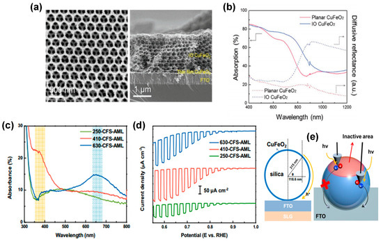Overcoming the limitations of CuFeO2 delafossite photocathodes has also been addressed using strategies aimed at enhancing light absorption, reducing surface reflection by multiple scattering, and facilitating the formation of samples with a short carrier diffusion length. For example, an inverse opal (IO) nanostructure was proposed by Oh et al. [77] using an opal template and sol infiltration. In comparison with planar CuFeO2 photocathodes, the dimensionally ordered IO structure with a hexagonal skeleton and eight layers of a microporous structure (see Figure 7a) exhibits an evident absorption enhancement at 600–800 nm compared to planar CuFeO2 (see Figure 7b). IO-CuFeO2 photocathodes exhibited nearly twice the PEC performance of the planar CuFeO2, with a photocurrent density of 1.05 mA cm−2 at 0 V versus RHE.