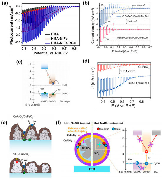 The formation of heterojunctions to increase the charge separation of photogenerated charge carriers is often proposed in combination with other strategies. For example, Jang et al. [80] used HMA-treated CuFeO2 electrodes for coupling with a hydrogen evolution reaction (HER) electrocatalyst onto its surface. The authors particularly used nickel-iron layered double hydroxide (NiFe LDH) prepared by a one-step hydrothermal method and deposited on HMA-CuFeO2 photocathodes (HMA-NiFe). Additionally, a combination of NiFe LDH and reduced graphene oxide (HMA-NiFe/rGO) was investigated. Both modifications (Figure 8a) led to drastic improvements in photocurrent generation up to −2.4 mA cm−2 at 0.4 VRHE, being a 7–8 fold and 1.5–2 fold increase for HMA-NiFe/rGO relative to unannealed CuFeO2 and HMA-CuFeO2 photocathodes, respectively. Oh et al. [77] modified IO-CuFeO2 and planar CuFeO2 photocathodes with a CoFe LDH catalyst and a C60 layer, respectively. The determined photocurrent density of −4.86 mA cm−2 at 0 V vs. RHE (Figure 8b) was shown to be a factor of 2 larger than the HER performance of the planar CuFeO2/C60/CoFe LDH photocathode. IPCE measurements revealed that the IO-CuFeO2-based photocathode exhibited a high IPCE value of 17.5% at 600 nm due to both increased light absorption and enhanced charge transfer/extraction.
