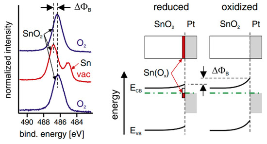 (Left) Sn 3d photoelectron spectra recorded from a polycrystalline SnO2 thin film coated with ~2 nm Pt. (Right) Energy band diagrams and schematic interface chemical structures of oxidized and reduced SnO2–Pt interfaces. Reprinted with permission from ref. [115], Copyright (2012), Thin Solid Films.