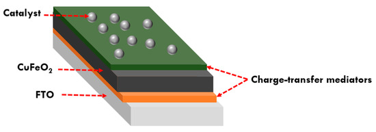 Recent research focusing on the integration of mediators such as conductive polymers, metal nanoparticles, or molecular catalysts into selective contacts for photocathodes represents a notable advancement in the field [116]. These mediators can enhance charge transfer, facilitate electron or hole transport, and improve overall efficiency in PEC applications. While previous studies have examined hole or electron selective contacts individually, integration of both types of contact has thus far not been reported. Notably, the integration of a hole-selective contact between FTO and CuFeO2, which is essential for impeding back electron transfer and facilitating hole transfer to FTO, is a significant development. Additionally, the integration of an electron-selective contact between CuFeO2 and the catalyst or electrolyte, aimed at enhancing charge transfer and overcoming the hindrance posed by the high density of surface states within CuFeO2, is noteworthy. These integrated systems, driven by electrochemical potential gradients and employing multimediators, hold immense promise for significantly enhancing charge separation and transportation (Figure 10).