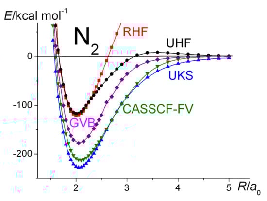 - Langhoff, S.R.; Davidson, E.R. Configuration interaction calculations on the nitrogen molecule. Int. J. Quantum Chem. 1974, 8, 61–72. [Google Scholar] [CrossRef]