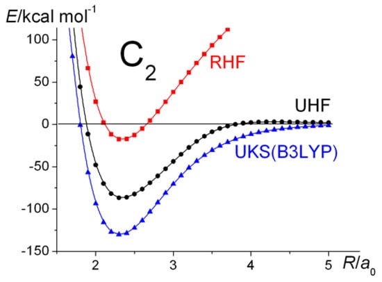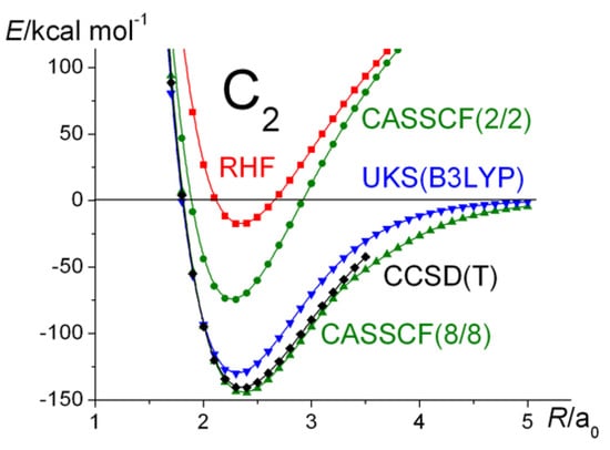 - Fougere, P.F.; Nesbet, R.K. Electronic Structure of C2. J. Chem. Phys. 1966, 44, 285–298. [Google Scholar] [CrossRef]