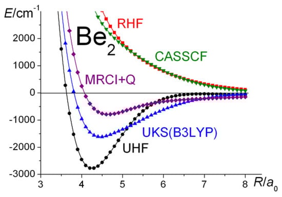- Mitin, A.V. Ab initio calculations of weakly bonded He2 and Be2 molecules by MRCI method with pseudo-natural molecular orbitals. Int. J. Quantum Chem. 2011, 111, 2560–2567. [Google Scholar] [CrossRef]