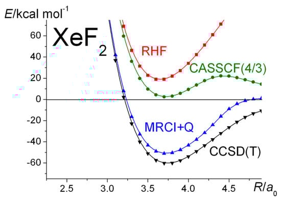 - Krauss, M.; Liu, B. The Energy Curve of XeF, X 2Σ+. Chem. Phys. Lett. 1976, 44, 257–260. [Google Scholar] [CrossRef]