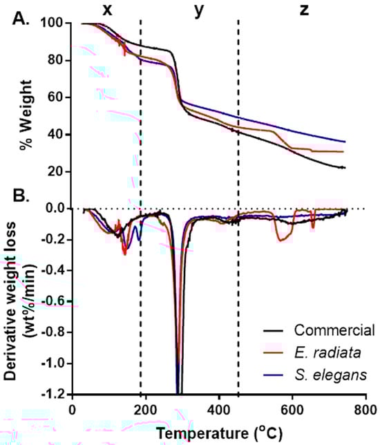 The initial degradation stage, denoted as x, occurred between 30 °C and 180 °C, resulting in a mass loss of approximately 8–17%. This stage is attributed to the evaporation of physically adsorbed and hydrogen-bonded water molecules within the alginate matrix [27]. The second degradation stage (y), observed between 221 °C and 317 °C, represented the most significant mass loss (Figure 1). This phase corresponds to the thermal decomposition of the alginate polymer backbone. Among the samples, the commercial sodium alginate exhibited the highest weight loss (47%), followed by the E. radiata (41%) and S. elegans (36%) extracts. These differences may reflect variations in the molecular structure and purity of the alginate samples, particularly regarding their mannuronic to guluronic acid ratios [28]. The final degradation stage, denoted as z, was observed between 580 °C and 620 °C and was particularly pronounced in the E. radiata extract (Figure 1). This phase is associated with the decomposition of residual sodium carbonate (Na2CO3), a byproduct often formed during alginate processing [24], the thermal degradation profiles of the sodium alginate extracts closely mirrored those of the commercial standard, which is consistent with findings from previous studies [25], further supporting the similarity in thermal stability between the extracted and commercial alginates.