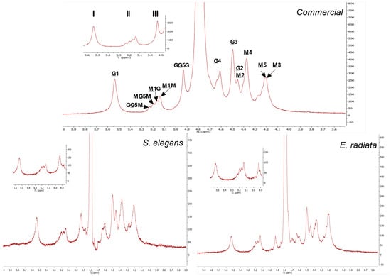 1H NMR spectra at 70 °C of commercial sodium alginate and alginate extracted from E. radiata and S. elegans harvested from the South African coastline. The underlined M and G denote proton signals corresponding to D-mannuronic acid (M) and L-guluronic acid (G) residues, respectively. Non-underlined letters represent neighboring residues along the copolymer chain. The numbers indicate the specific protons responsible for each signal in the spectra.