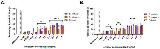 The inhibitory activity of sodium alginates against p-nitrophenyl butyrate (pNPB) and p-nitrophenyl octanoate (pNPO) substrates highlighted a substrate-specific efficacy. Higher inhibition levels were observed for pNPB, indicating greater efficacy against shorter-chain triglycerides. The dose-dependent trend is evident for E. radiata and S. elegans, with increasing alginate concentrations resulting in greater inhibition, consistent with previous findings [6,10]. Although alginate inhibition was moderate compared to the anti-obesity drug orlistat, their natural origin and safety profile make them appealing for dietary interventions targeting obesity. Through statistical analysis, it was determined that the inhibition displayed by the extracts was significant; however, there was no statistical difference (p < 0.05) between the seaweed species in terms of their inhibition of pancreatic lipase (Figure 4).