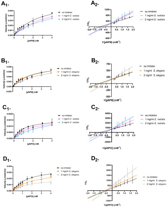 Mode of inhibition studies on pancreatic lipase. The effect of extracted sodium alginates on p-nitrophenyl butyrate and octanoate is shown. (A) E. radiata on p-nitrophenyl butyrate. (B) S. elegans on p-nitrophenyl butyrate. (C) E. radiata on p-nitrophenyl octanoate. (D) S. elegans on p-nitrophenyl octanoate. (X1) respective Michaelis–Menten plot. (X2) respective Lineweaver–Burk plot. Error bars indicate standard deviations (n = 3).