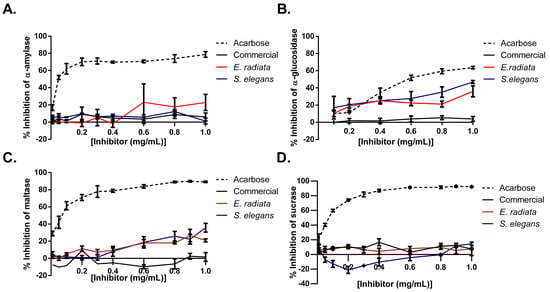 Inhibition of type 2 diabetes-relevant enzymes: (A) α-amylase, (B) α-glucosidase, (C) maltase, and (D) sucrase by sodium alginates and acarbose (positive control). Error bars indicate the standard deviation (n = 6).