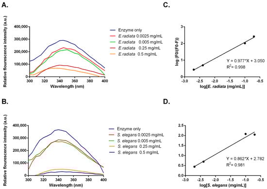 (A,B) Fluorescent emission spectra and (C,D) modified Stern–Volmer plots for fluorescent quenching of α-glucosidase by sodium alginate from E. radiata and S. elegans.