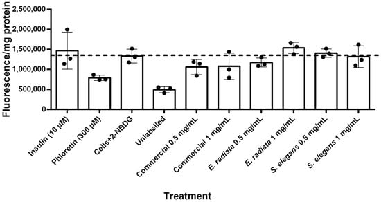 The t-tests were performed using GraphPad Prism software version 10 (GraphPad Inc., Boston, MA, USA). Significant differences in glucose uptake and enzyme activity between the absence and presence of inhibitors were assessed using t-tests. The t-tests were conducted using the data analysis tools in GraphPad Prism software version 10 (GraphPad Inc.). Two-way ANOVA was used for the analysis of enzyme activity in the presence of inhibitors. Differences were considered statistically significant at p < 0.05.