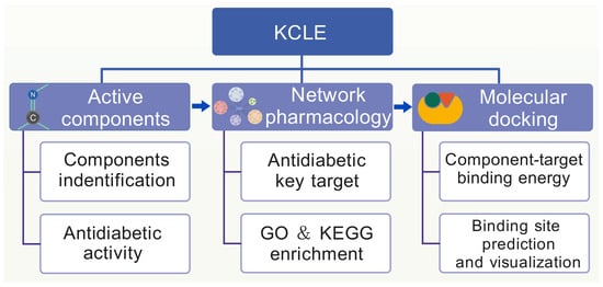 In this study, we used water to extract the active components of K. coccinea leaves to obtain K. coccinea leaf extract (KCLE). Subsequently, UPLC-Q-TOF/MS was used to determine the chemical composition of KCLE and network pharmacology was used to systematically analyze the active components, potential targets and pathways of the KCLE in the treatment of T2DM. Molecular docking was used to predict the interaction between important compounds and predicted targets. Our results reveal the potential mechanism of the KCLE in treating T2DM and could help to promote the development of new drugs for diabetes. The study workflow is shown in Figure 1.