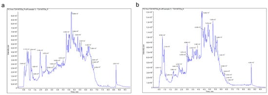 (a) The total ion chromatogram (TIC) of KCLE obtained in a positive ion mode. (b) The total ion chromatogram (TIC) of KCLE obtained in negative ion mode.