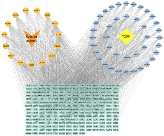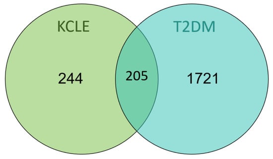 The Human Genome Annotation (GeneCards) database (https://www.genecards.org/, accessed on 5 November 2024) and OMIM database (https://www.omim.org/, accessed on 5 November 2024) were used to obtain the related target genes with “Type 2 Diabetes Mellitus” as the search term [70,71]. The Uniprot database was used to standardize, merge and remove duplication, and the target genes of T2DM were obtained.