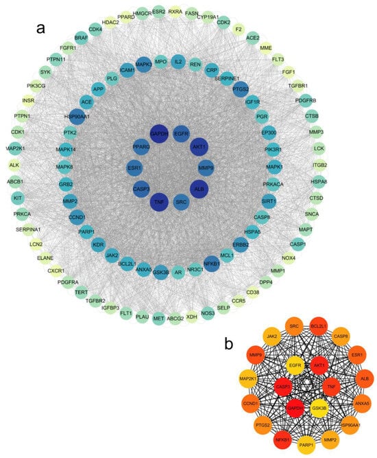 Network pharmacology analysis results. (a) PPI network of the common target genes. Diamonds represent proteins, the colors (from blue to green to yellow) indicate the degree of binding between proteins, and the lines represent protein-protein interactions. (b) The core target in the PPI network; the color depth represents its interaction strength.