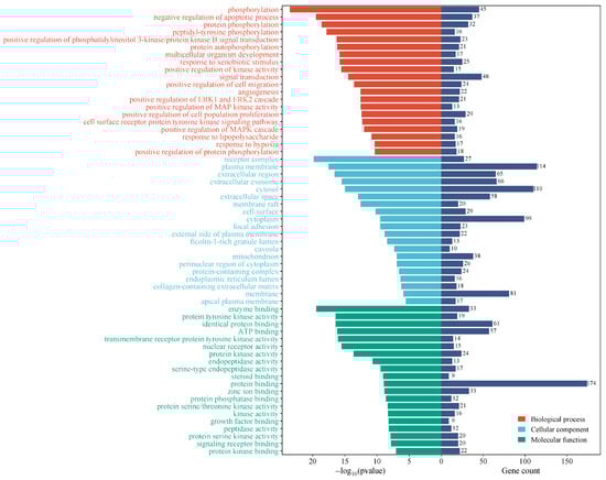 The KCLE therapeutic targets related to T2DM were subjected to GO analysis, and a total of 462 GO terms were obtained (p < 0.01) including 323 terms for biological process, 54 terms for cellular component, and 85 terms for molecular function. The top 20 terms are illustrated in Figure 7. The biological process mainly involved phosphorylation, negative regulation of the apoptosis process, protein phosphorylation, peptide tyrosine phosphorylation, positive regulation of phosphatidylinositol 3-kinase/protein kinase B signal transduction, etc. The cellular components mainly involved receptor complexes, cytoplasmic membranes, extracellular regions, extracellular exosomes, cytosol, etc. Molecular functions mainly involve protein tyrosine kinase activity, ATP binding, transmembrane receptor protein tyrosine kinase activity, nuclear receptor activity, protein kinase activity, etc.