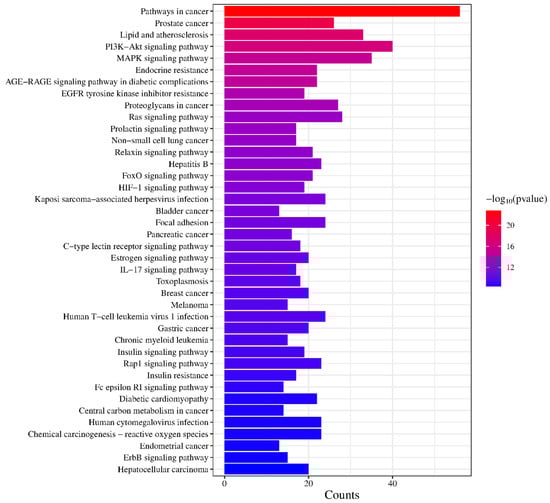 KEGG pathway enrichment analysis yielded 150 pathways (p < 0.01) and the top 40 pathways were selected for visualization, as shown in the Figure 8. Among the top 40 pathways, the overlapping genes were densely mapped to Pathways in cancer, Prostate cancer, Lipid and atherosclerosis, PI3K-Akt signaling pathway, MAPK signaling pathway, Endocrine resistance, AGE-RAGE signaling pathway in diabetic complications, EGFR tyrosine kinase inhibitor resistance, Proteoglycans in cancer, Ras signaling pathway, Prolactin signaling pathway, Non-small cell lung cancer, Relaxin signaling pathway, Hepatitis B, FoxO signaling pathway, etc. In addition, the predicted pathways (p < 0.01) included the Insulin signaling pathway, Insulin resistance, Estrogen signaling pathway, Diabetic cardiomyopathy, C-type lectin receptor signaling pathway, and IL-17 signaling pathway, suggesting that the active components of KCLE may exert hypoglycemic effects by regulating immune, insulin, and inflammation pathways.