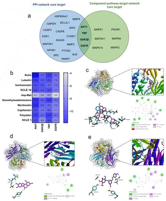Molecular docking results of the important compounds and the corresponding proteins of the gene targets. (a) Venn diagram of PPI network core targets and component-pathway-target network core targets. (b) The binding energy of the target protein and the active ingredient, measured in kcal/mol, indicates a stable binding when the binding energy is less than −5.0 kcal/mol. (c) Visualization of the docking results of AKT1 and rutin. (d) Visualization of the docking results of TNF and demethylwedelolactone. (e) Visualization of the docking results of TNF and polydatin.