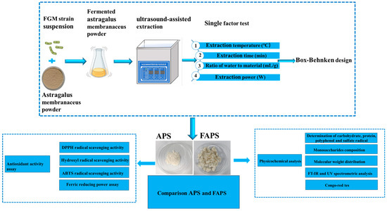 The specific composition and structure of APS can vary depending on the extraction method [3], and the relationship between structure and activity needs to be further explored. Our investigation indicated that the increased FAPS was linked to a high metabolic flux toward exopolysaccharide (EPS) formation, which appeared to be regulated by the dexB and galE genes in strain FGM [16]. Consequently, we hypothesize that the composition, structure, and activity of FAPS may differ from those of APS extracted using conventional techniques. Therefore, this study was conducted in two sequential phases: initial systematic optimization of UAE parameters for crude FAPS, followed by a comprehensive comparative analysis of the chemical profiles, monosaccharide constituents, molecular weight distributions, and antioxidant capacities between conventional APS and FAPS, as schematically presented in Figure 1. The findings aimed to provide a robust data foundation for the efficient extraction and further development and utilization of fermented Astragalus polysaccharides.