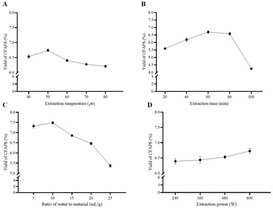 Effects of different extraction temperatures (A), extraction times (B), ratios of water to material (C) and extraction powers (D) on the yield of crude FAPS (CFAPS).