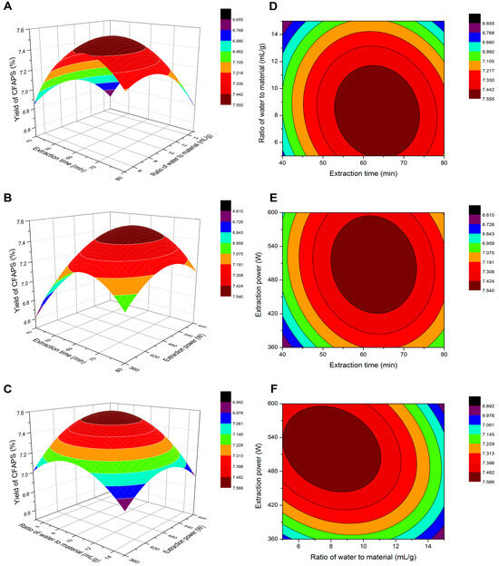 The three dimensional response surface plots and two dimensional contour plots show the interaction effects between water to material ratio and extraction time (A,D), extraction power and extraction time (B,E), extraction power and the ratio of material on the yield of CFAPS (C,F).