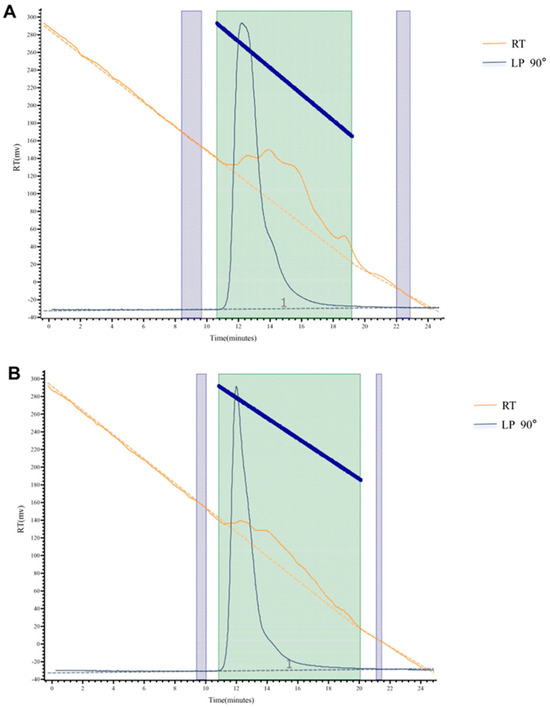 The molecular weight distribution of FAPS and APS was determined by the HPGPC method [57] with slight modifications. An Aligent 1260 Infinity II MDS gel permeation chromatograph equipped with a differential detector, a dual-angle laser scattering detector, and a PL aquagel-OH Mixed-H column (7.5 × 300 mm, 8 μm, molecular weight range 500–10,000,000) was used for detection. The sample was dissolved in the mobile phase (deionized water with 0.01% sodium azide) to prepare a 1–3 mg/mL solution, and 20 μL was injected into the machine after passing through a 0.22 μm microporous membrane, while the column temperature was 45 °C and the flow rate was 1.0 mL/min.