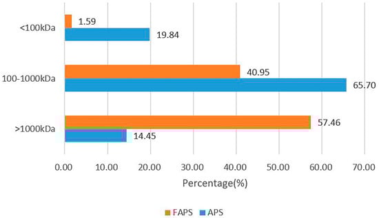 As shown in Figure 5A,B, the HPGPC spectra of APS and FAPS each showed only one narrow peak, indicating that both APS and FAPS were homogeneous polysaccharides [33]. The difference in the Mw value of polysaccharides was related to the sugar composition, glycosidic bond and the connection mode of the branched chain [34]. A degree of dispersion (Mw/Mn) of polysaccharides is indicative of uniformity, and a degree of dispersion greater than unity reflects a wide molecular weight distribution [35]. It can be seen from Table 5 that the Mp, Mw and Mn of FAPS were higher than that of APS, but the PDI of FAPS was lower than that of APS, indicating better uniformity of FAPS. Using microorganisms for fermentation, the polysaccharide structure will be affected by the fermentation process [36]. It was reported that the Mn of EPS in lactic acid bacteria (LAB) was about 376–5210 KDa, and the Mw and PDI of APS were between 48–140 KDa and less than 23.0, respectively [37], which is similar to our findings [38]. As shown in Figure 6, the proportion of high molecular weight (>1000 kDa) components in FAPS was higher than in APS, and the proportion of medium molecular weight (100–1000 kDa) and lower molecular weight (<100 kDa) components in FAPS was lower than in APS. This is consistent with the data from Table 5. Therefore, it can be concluded that the fermentation of A. membranaceus with LAB strains increases the molecular weight of polysaccharides in the product.