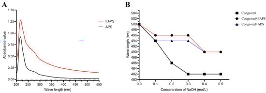 As shown in Figure 8, APS and FAPS had no absorption peak at the wavelength of 280 nm, which is inconsistent with the chemical composition results in Table 3. Considering the removal of free proteins by the Sevage reagent and the protein content detected by the BCA method, it was speculated that APS might be a polysaccharide containing binding proteins, that is, a proteoglycan. The APS-gonorrhoin reagent and FAPs-gonorrhoin reagent did not form a complexation reaction that increased the maximum absorption wavelength, and the wavelength gradually decreased with the increase of the concentration of sodium hydroxide, indicating that neither of them contained a three-strand helical structure.