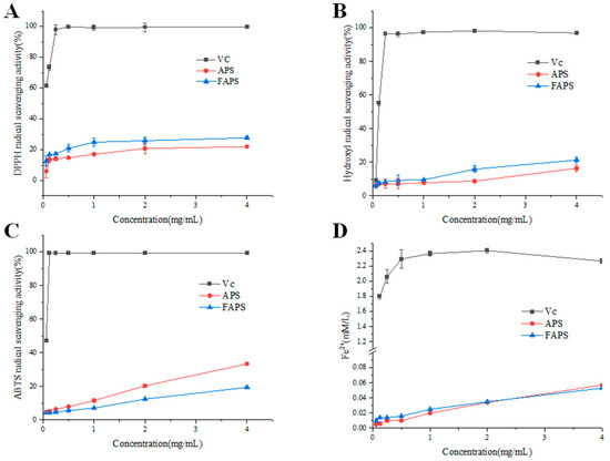 DPPH is often employed as a representative reagent to examine the free radical scavenging activities of bioactive compounds. The antioxidant activity of polysaccharides is attributed to their hydrogen-donating capacity [43]. The DPPH radical is a stable proton radical with a maximum absorption peak at the wavelength of 517 nm. In an ethanol solution it appears purple, while the color will fade when a proton-donating substance is present. This change is very rapid and is highly sensitive for the detection of antioxidant activity [44]. As shown in Figure 9A, the DPPH free radical scavenging rates of APS and FAPS were increased in a quadratic concentration-dependent manner. The positive control Vc had a strong antioxidant activity (99.49%) at a concentration in solution of 4 mg/mL. However, the DPPH radical scavenging rates of FAPS and APS were 26.40% and 20.81%, respectively. It is reported that the carboxyl and hydroxyl groups in uronic acid provide more active sites for reacting with DPPH radicals [45]. Moreover, reducing sugars (such as glucose, fructose, etc.) can significantly enhance the scavenging ability of DPPH radicals by providing hydrogen atoms or electrons. For example, one study revealed that the antioxidant capacity of honey is positively correlated with its reducing sugar content, and the reducing sugars significantly enhanced the scavenging effect on DPPH radicals by providing hydrogen atoms or electrons [46]. Other studies evaluated the antioxidant activity of reducing sugars (such as glucose and fructose) and explored their roles in food systems, and found that reducing sugars effectively scavenged free radicals, and their activity exhibited a positive correlation with concentration [47,48]. The DPPH radical scavenging rate of FAPS was greater than APS, and the reason might be related to the increased GalA content and higher concentration of reducing sugars in FAPS. Moreover, proteins or polypeptides in FAPS also appear to increase the DPPH free radical detection of those macromolecules, thereby revealing their antioxidant activity [49].