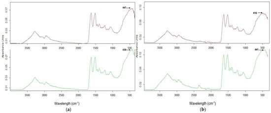 In the frame of current study, the ATR-FTIR spectra from Figure 1a show absorption bands at 438 cm−1 and at 447 cm−1, which had been attributed to ZnO the stretching frequency of ZnO bonds. The ATR-FTIR spectra from Figure 1b show absorption bands at 441 cm−1 and at 416 cm−1, which can be attributed to the stretching frequency of Mg–O bonds, as reported by as reported by Seghir et al. [29]. Compared to ZnO nanoparticles synthesized using Portulaca oleracea extract [34], where ZnO bonds were identified at 450 cm−1, the current study demonstrates slightly shifted peaks, which could be attributed to the ovalbumin-mediated synthesis process, leading to different bonding environments.