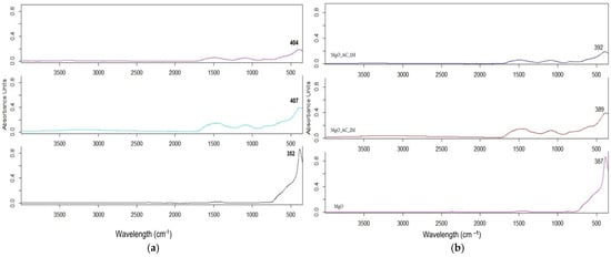 For all samples calcinated at 550 °C for 2 h, the ATR-FTIR analysis consisted of a comparison with commercial ZnO and MgO powders of analytical purity, as shown in Figure 2. The pure ZnO presents an absorption band at 352 cm−1, while the pure MgO presents an absorption band at 387 cm−1 (black line in Figure 2).